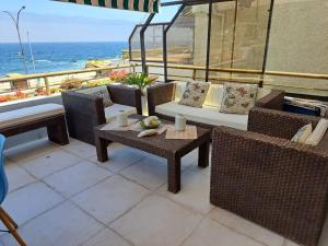 The apartment is equipped with 2 bedrooms, 3 bathrooms, bed linen, towels, a flat-screen TV with cable channels, a fully equipped kitchen, and a terrace with sea views. The property has an outdoor dining area.